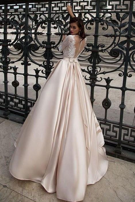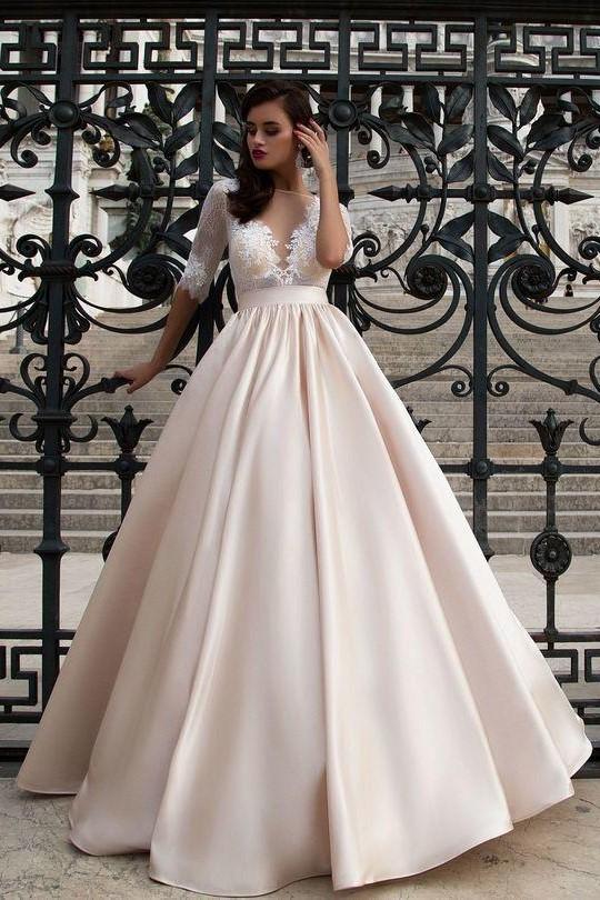 This formal ballgown with sheer bodice is bold and beautiful. An ideal design for a traditional wedding. This gown features a bateau neckline that extends into a half, illusion-lace sleeves. From the waist, a light champagne satin skirt extends beautifully into a full ballgown silhouette. A sheer lace design highlights the back of the gown and with sheer bodice zips up beneath fabric-covered buttons. Custom size is recommended, totally free. If you can't find the color you want above, please write your color or your custom made measurements in the checkout step, or send us your color image and measurements through email. You can click CONTACT US.