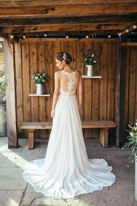 Turn heads in this boho wedding dress. Lace bodice accentuates the illusion neckline of this A-line gown. Boho lace detailing and chiffon skirt, giving this wedding dress a unique, bohemian look. The back of this gown features a detailed lace back – perfect for the free-spirited bride! The back zips up beneath fabric buttons for an added pop of boho chic style for your wedding day style! Available in plus size. *Colors may photograph differently under studio lighting. Custom size is recommended, totally free. If you can't find the color you want above, please write your color or your custom made measurements in the checkout step, or send us your color image and measurements through email. You can click CONTACT US.