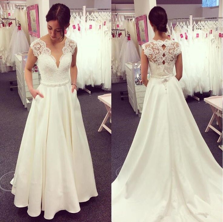 Lace cap sleeves satin wedding dress with pockets