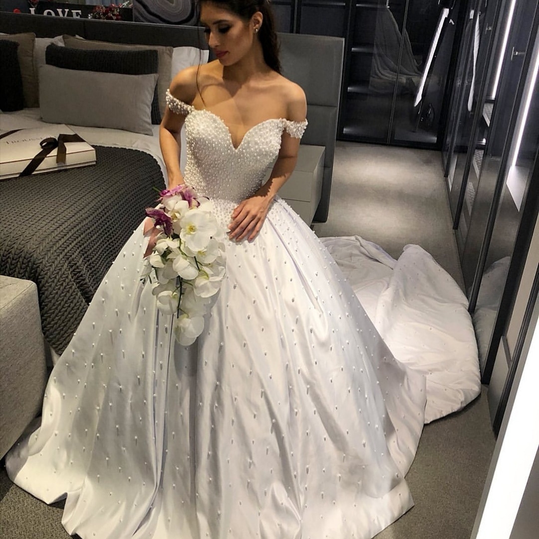 Long Train Pearls Wedding Gowns Satin Off-the-shoulder
