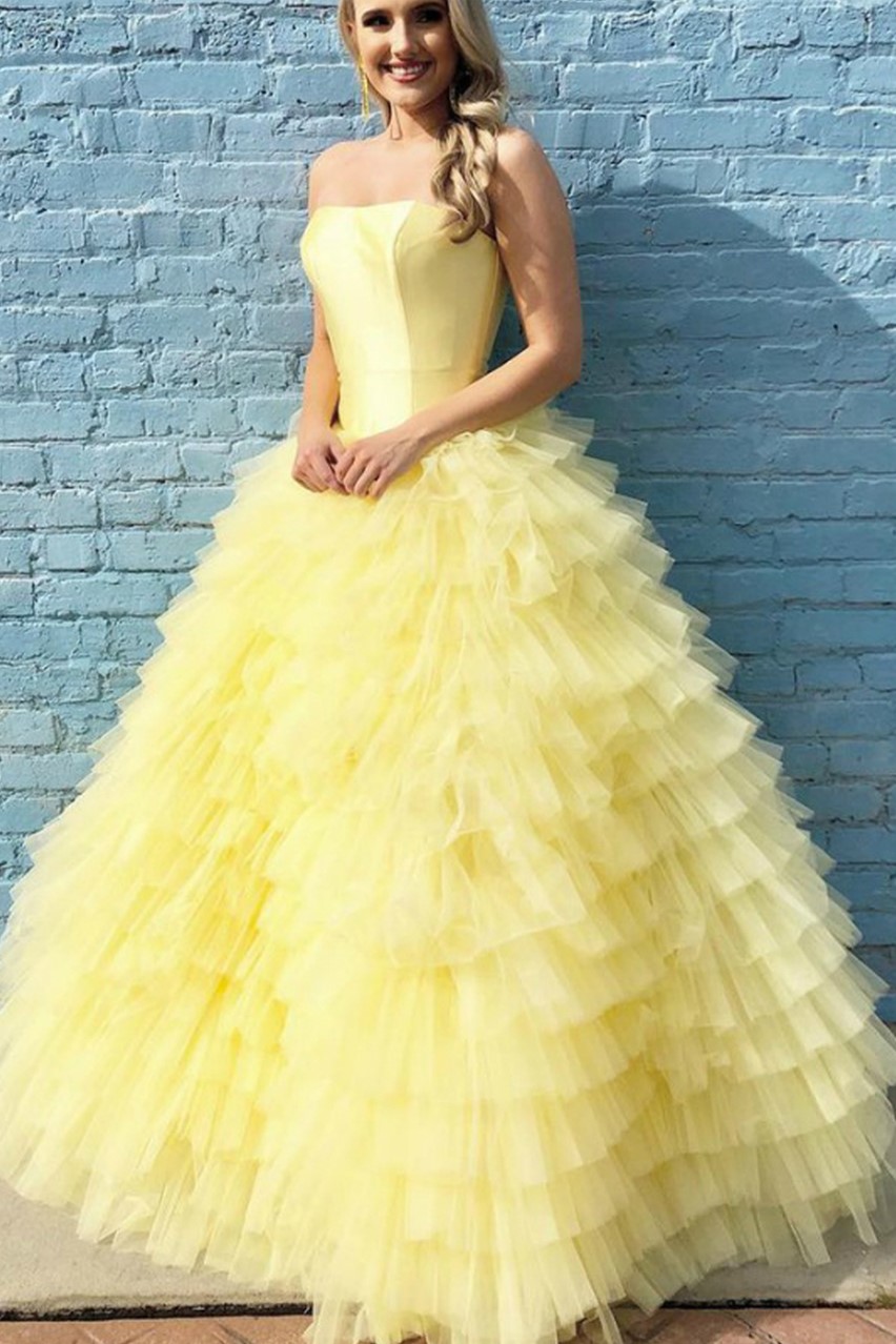 Strapless Satin Yellow Prom Ball Gown Dress with Tulle Tiered Skirt
