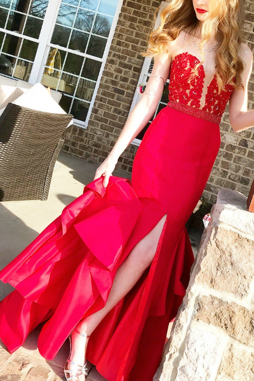This amazing red gown features a plunging sweetheart neckline with beaded lace details, beads waistband, slit side mermaid satin skirt with ruffles details. The back can be custom made with zip-up or lace-up. Also available in plus sizes and a wide range of colors. *Colors may photograph differently under studio lighting. Custom size is recommended, totally free. If you can't find the color you want above, please write your color or your custom made measurements in the checkout step, or send us your color image and measurements through email. You can click CONTACT US.