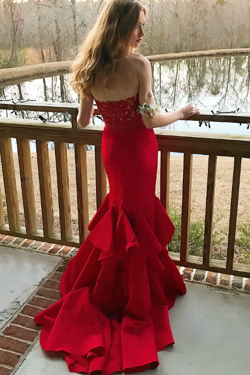 Plunging Sweetheart Lace Red Mermaid Prom Gown with Ruffled Skirt