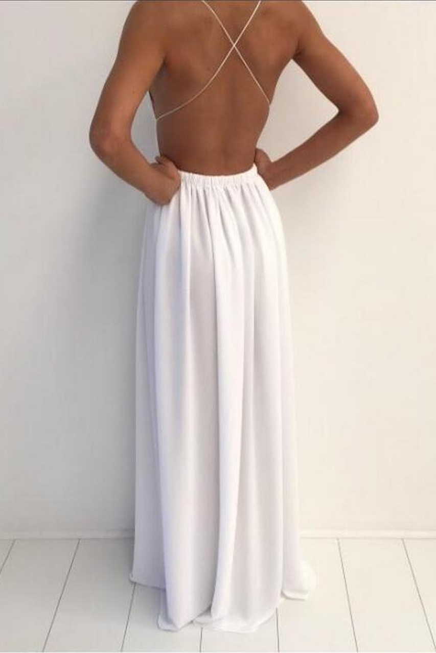 Floor-Length White Chiffon Prom Dress with Deep V-neckline