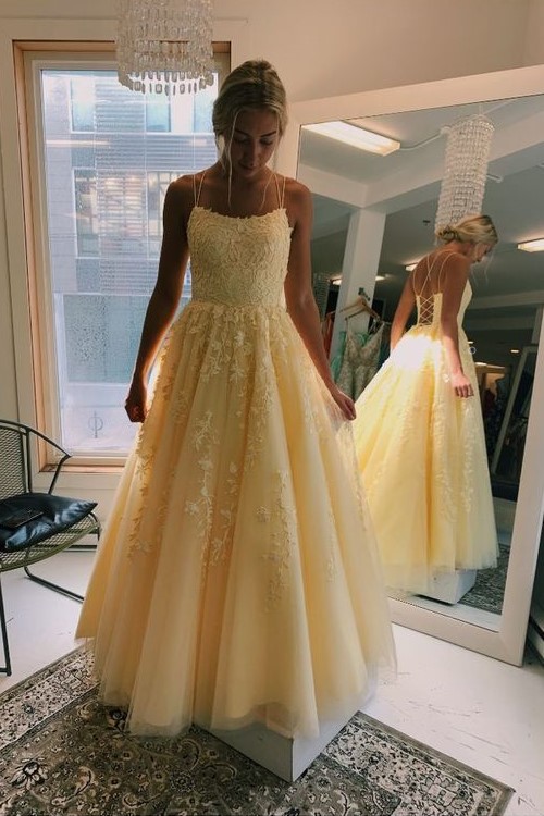 Floor-length Yellow Prom Dresses with Lace Strappy Back