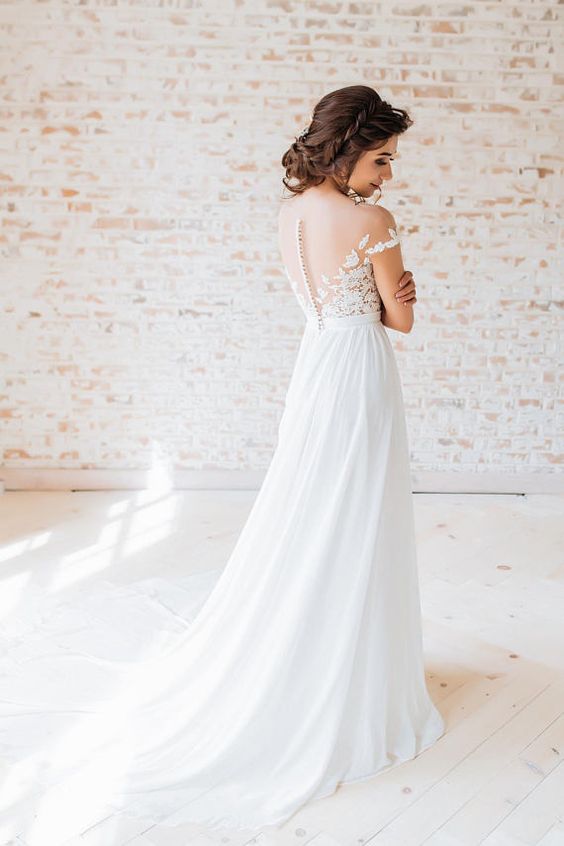 Chiffon&Lace Boho Wedding Gown with Sheer Sleeves