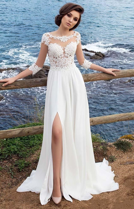 Illusion Appliques Sleeves Beach Wedding Dresses with Chiffon Skirt