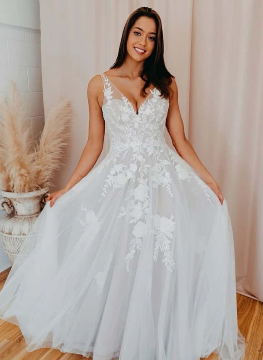 V-neck Tulle Wedding Gown with Floral Appliqued Bodice
