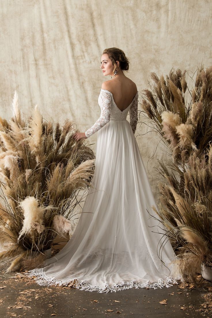 Chiffon Lace Sleeves Boho Bride Dress with Tassel Hem