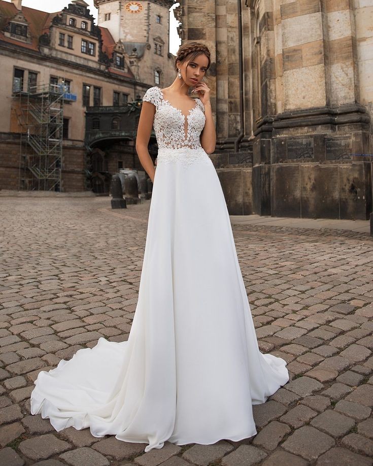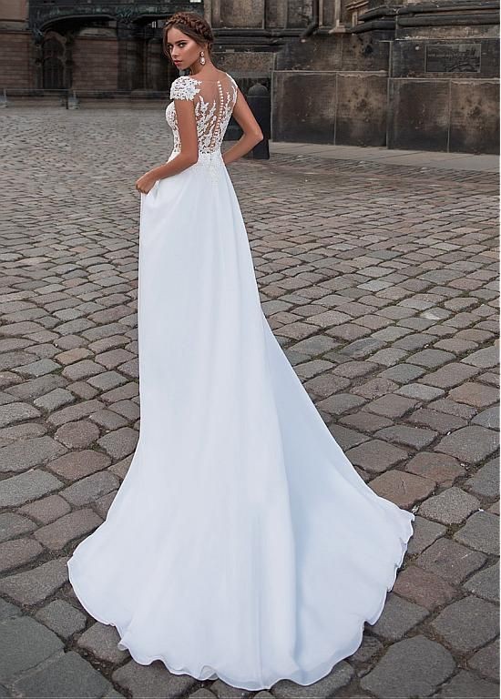 Sheer Lace Chiffon Boho Bridal Dress with Cap Sleeves