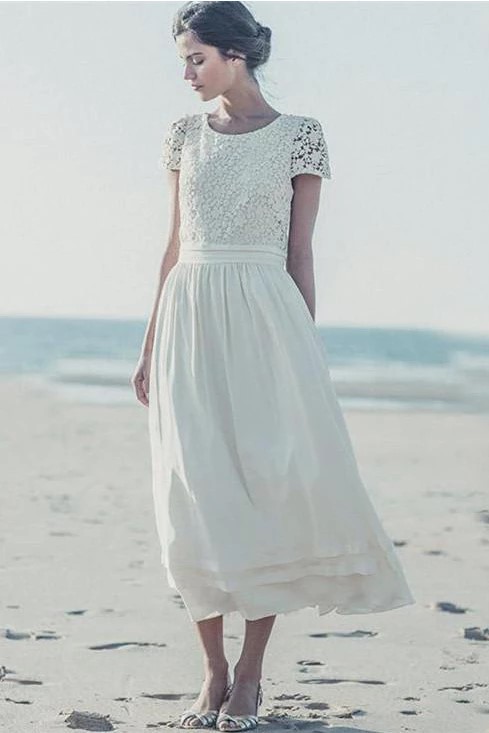 Lace Short Sleeves Tea-Length Bridal Dress for Beach Weddings