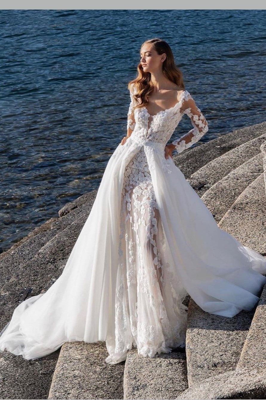 This stunning gown features a wide V-neckline with full sleeves, slim fitting bodice with all appliques, romantic tulle train can be made with a detachable style. It can be custom made to your exact measurements. *Colors may photograph differently under studio lighting. Custom size is recommended, totally free. If you can't find the color you want above, please write your color or your custom made measurements in the checkout step, or send us your color image and measurements through email. You can click Contact Us.
