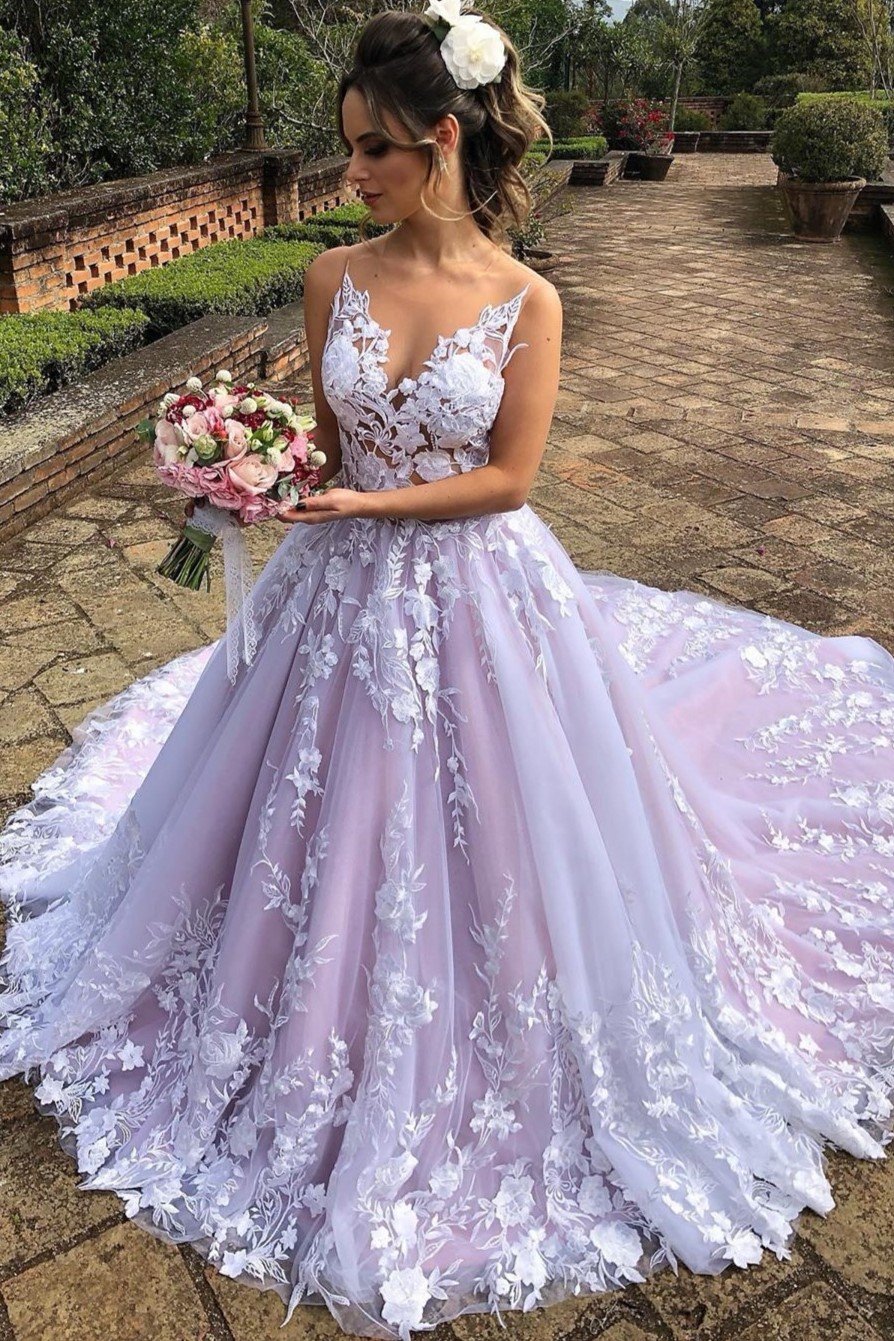 V-neckline Lace Floral Wedding Gown with Contrast Color Skirt