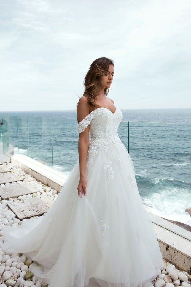 Say “yes” to natural beauty with this princess gown! This feminine A-line silhouette, featuring off-shoulder sleeves and a sweetheart neckline for a highlighted décolletage. A completely sweet look, fashion-forward brides will love the simplicity and comfortable wearability of the silhouette. Full A-line skirt of layered tulle. This gown features a manageable train to maintain volume and weightlessness to the overall design, and lace-up back. It can be custom made to your exact measurements. *Colors may photograph differently under studio lighting. Custom size is recommended, totally free. If you can't find the color you want above, please write your color or your custom made measurements in the checkout step, or send us your color image and measurements through email. You can click Contact Us.