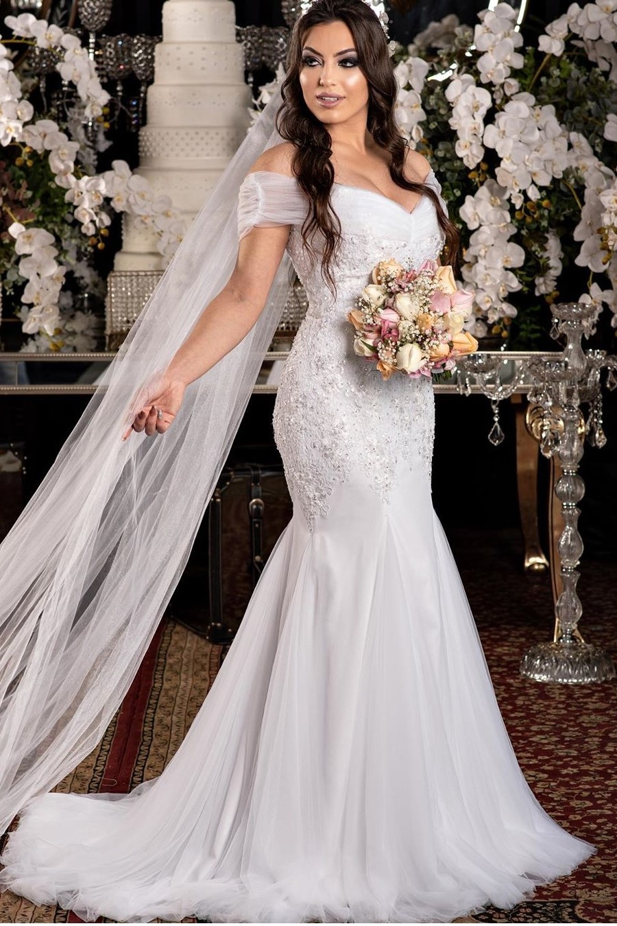 This classic fit and flare gown features a tulle ruching off-the-shoulder design, slim bodice with beads and pearls over the lace appliques. Tulle skirt with a slight train finish. Also available in plus sizes and more colors. *Colors may photograph differently under studio lighting. Custom size is recommended, totally free. If you can't find the color you want above, please write your color or your custom made measurements in the checkout step, or send us your color image and measurements through email. You can click CONTACT US.