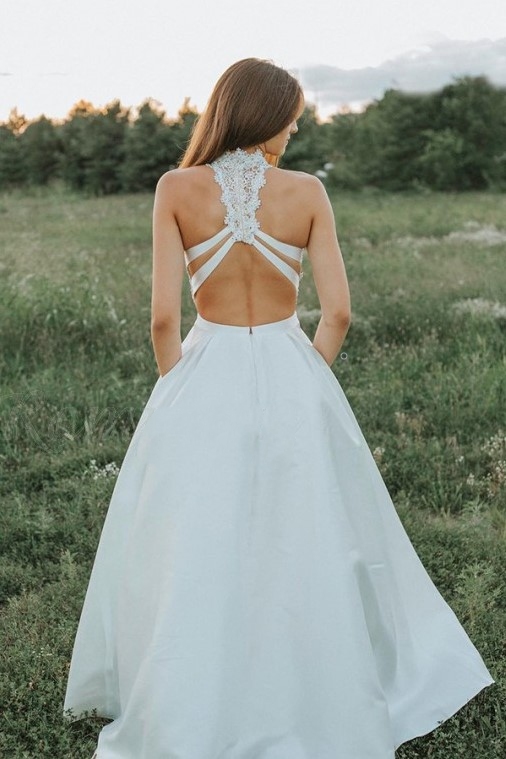 This popular two piece bridal dress features a lace top with unique halter back. A-line satin skirt with modern pockets for cconvenience. Also available in plus sizes and more colors. *Colors may photograph differently under studio lighting. Custom size is recommended, totally free. If you can't find the color you want above, please write your color or your custom made measurements in the checkout step, or send us your color image and measurements through email. You can click CONTACT US.