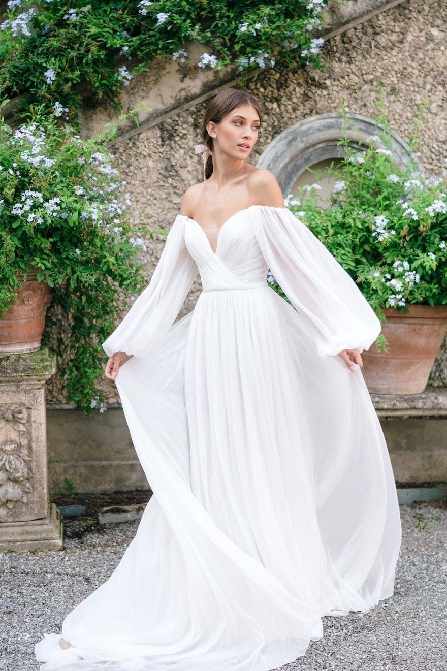 This bold design bridal gown features a ruching bodice with loose long sleeves. Unique off-the-shoulder with sheer insert tulle connected. Flowing chiffon skirt with a sweep train. It can be custom made to your exact measurements and more colors. *Colors may photograph differently under studio lighting. Custom size is recommended, totally free. If you can't find the color you want above, please write your color or your custom made measurements in the checkout step, or send us your color image and measurements through email. You can click Contact Us.