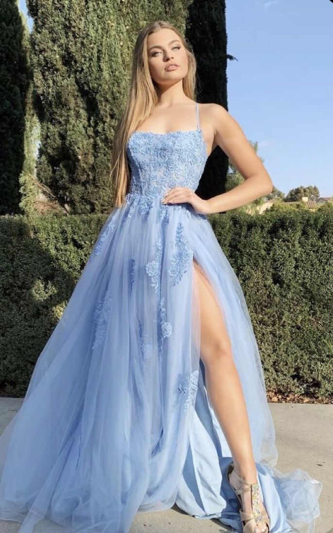 Blue Tulle Appliqués Prom Dresses with Lace-up Back