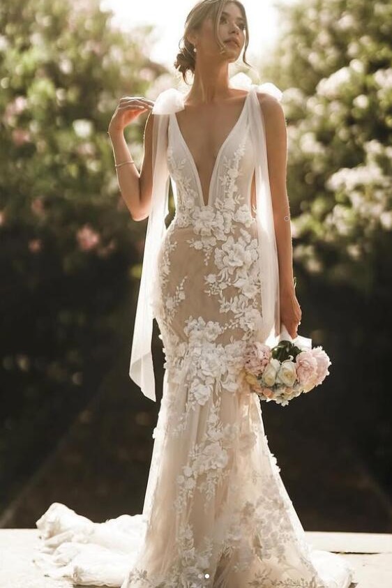 2025 V-neck Wedding Dresses with Floral Lace Appliques